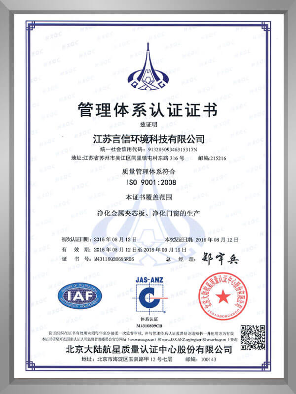 江蘇言信環(huán)境科技有限公司是一家致力于醫(yī)藥生物、食品、化妝品、實(shí)驗(yàn)室、手術(shù)室、活動(dòng)板房等行業(yè)潔凈環(huán)境新材料和設(shè)備研發(fā)與應(yīng)用的高科技股份制公司。公司位于素有“東方威尼斯”之稱的中國(guó)十大魅力名鎮(zhèn)之一“醇正水鄉(xiāng)、舊時(shí)江南”的蘇州同里,東臨上海、北依蘇州、西瀕太湖、南接浙江,到上海、蘇州市區(qū)僅40分鐘車程,交通便捷、環(huán)境優(yōu)越。公司占地15000多平方,公司創(chuàng)建于2005年,現(xiàn)已發(fā)展成為集手工夾芯板、機(jī)制夾芯板、凈化門窗和各類凈化設(shè)備的研發(fā)、設(shè)計(jì)、生產(chǎn)、銷售為一體的凈化材料系統(tǒng)化供應(yīng)商。公司先后引進(jìn)全套數(shù)控金屬成型機(jī)、自動(dòng)化激光、折彎連續(xù)生產(chǎn)線、AMADA數(shù)控精密鈑金設(shè)備、全自動(dòng)板材生產(chǎn)設(shè)備等先進(jìn)設(shè)備,公司先后通過IS09001認(rèn)證、國(guó)家防火建筑材料檢測(cè)認(rèn)證,產(chǎn)品暢銷海內(nèi)外。秉承傳統(tǒng)、創(chuàng)造經(jīng)典,我們期待著與您的真誠(chéng)合作,同耕耘、齊發(fā)展、幸福收成共分享。